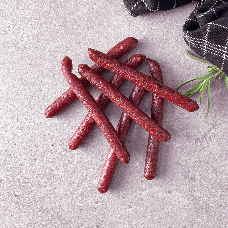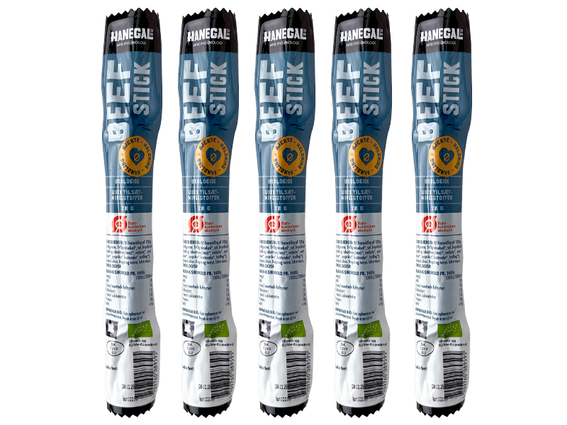 Hanegal Snackpølse af oksekød – Økologisk kvalitet i praktisk portionsformat. Mild og velsmagende snackpølse lavet af økologisk oksekød og krydret med paprika, koriander og peber for en afrundet smagsprofil. Røget over bøgeflis, hvilket tilfører en diskret røgsmag og ekstra dybde. Leveres enkeltvist indpakket – ideel til madpakker, kantinesortimenter, caféer eller som to-go snack. Kan også skæres i mindre stykker og indgå i tapas, salatbarer eller mødeforplejning, hvor både smag og præsentation tæller.