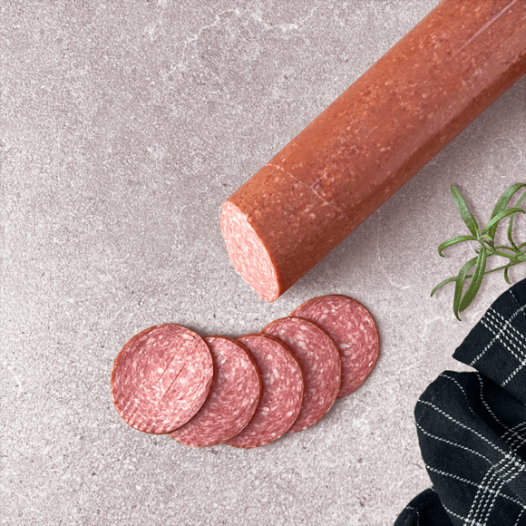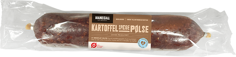 Hanegal Kartoffelspegepølse – Frisk smag og klassisk håndværk i én pølse. En økologisk spegepølse med en frisk og let syrlig smag fra kartofler, krydret med hvid peber og ingefær. Den særlige kombination giver pølsen en rund og karakteristisk smag, som skiller sig ud uden at være dominerende. Velegnet til frokostbuffeter, sandwichproduktion eller pålæg i kantiner, hvor man ønsker variation i udvalget uden at gå på kompromis med genkendelighed eller kvalitet. Leveres i 730 g – udviklet til professionelle køkkener, der prioriterer økologi og rene råvarer i storformat.