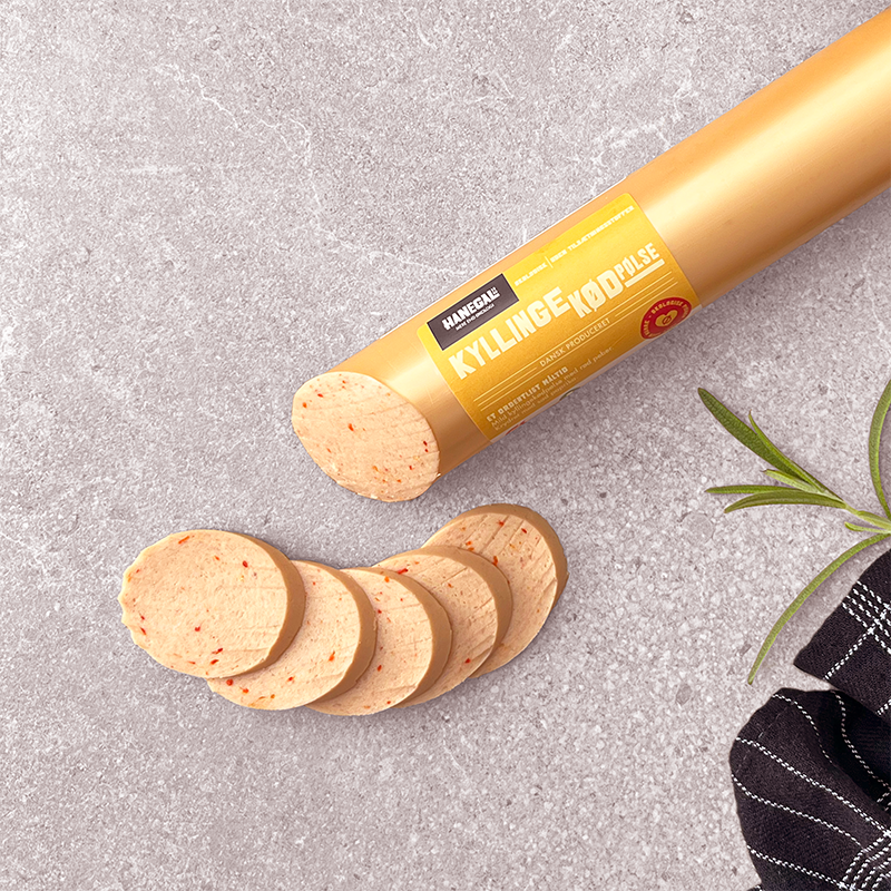 Hanegal Kyllingekødpølse – Mild og alsidig i det daglige sortiment. En økologisk kyllingekødpølse med en afrundet smag, smagt til med sød paprika, hvid peber og løg. Kendetegnet ved sin milde profil, der appellerer bredt – særligt til børn og brugere med fokus på lettere alternativer. Den faste struktur gør pølsen nem at skære og håndtere i storkøkkenet. Velegnet som pålæg på rugbrød, i sandwich eller på frokosttallerkenen. Et sikkert valg til kantiner, institutioner og andre professionelle køkkener, hvor økologi, kvalitet og anvendelighed går hånd i hånd.