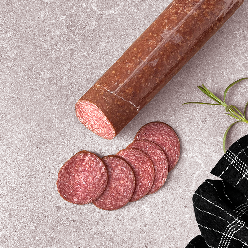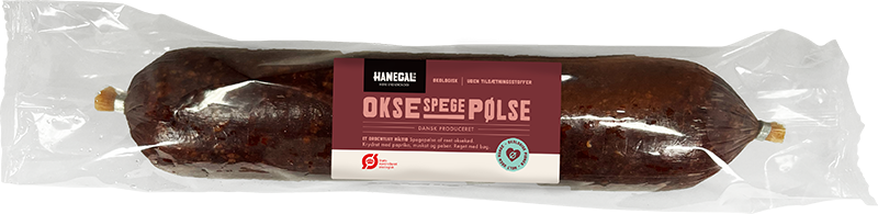 Hanegal Oksespegepølse – Økologisk spegepølse med dybde og karakter. En røget spegepølse lavet på økologisk oksekød og krydret med ingefær, paprika, muskat og sort peber. Smagen er markant, men velafbalanceret – med varme krydderier og en let røgsmag. Den store kaliber gør den ideel til professionel brug: nem at arbejde med i både buffetanretninger, sandwichproduktion og frokostordninger, hvor smagsprofilen gerne må skille sig lidt ud. Også velegnet til salater og tapas, hvor man ønsker en kødfuld og karakterfuld spegepølse med ren ingrediensliste. En kvalitetsløsning til køkkener, kantiner og catering, hvor økologi, smag og effektivitet går hånd i hånd.