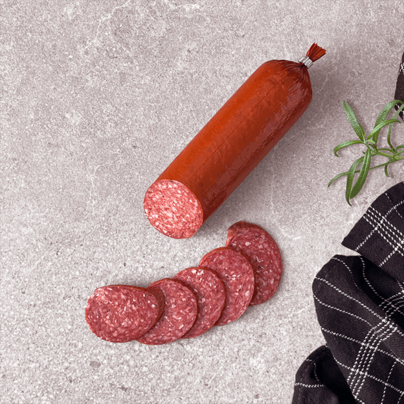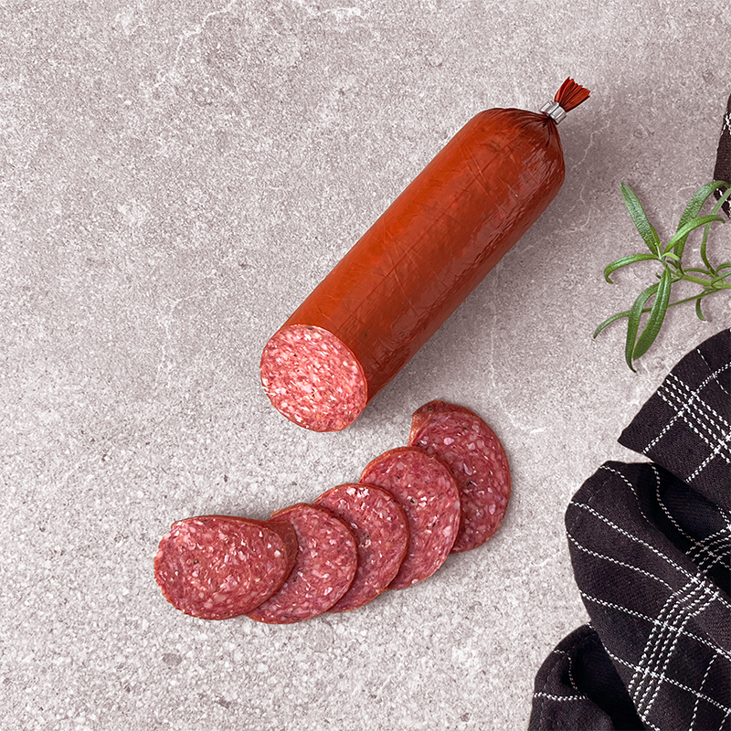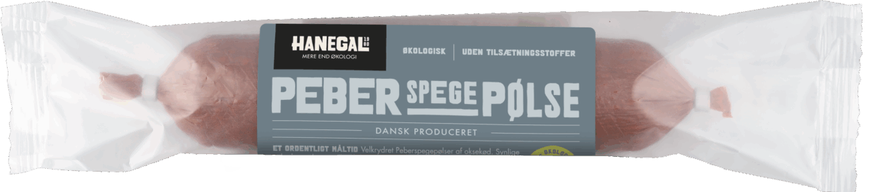 Hanegal Peberspegepølse – Kraftfuld smag med bid. Denne økologiske spegepølse er lavet af oksekød og krydret med knust peber og ingefær, hvilket giver en intens og markant smagsprofil. Røgningen tilfører ekstra dybde og karakter. Velegnet som skiveskåret pålæg i sandwich og smørrebrød, eller som et smagsstærkt indslag på frokostbuffeten. Peberets styrke gør pølsen ideel til kantiner og køkkener, der ønsker variation og tydelig smag i sortimentet. Et økologisk og velsmagende valg, der kombinerer fylde, krydderi og ansvarlige råvarer – til professionelle, der stiller krav til både smag og kvalitet.