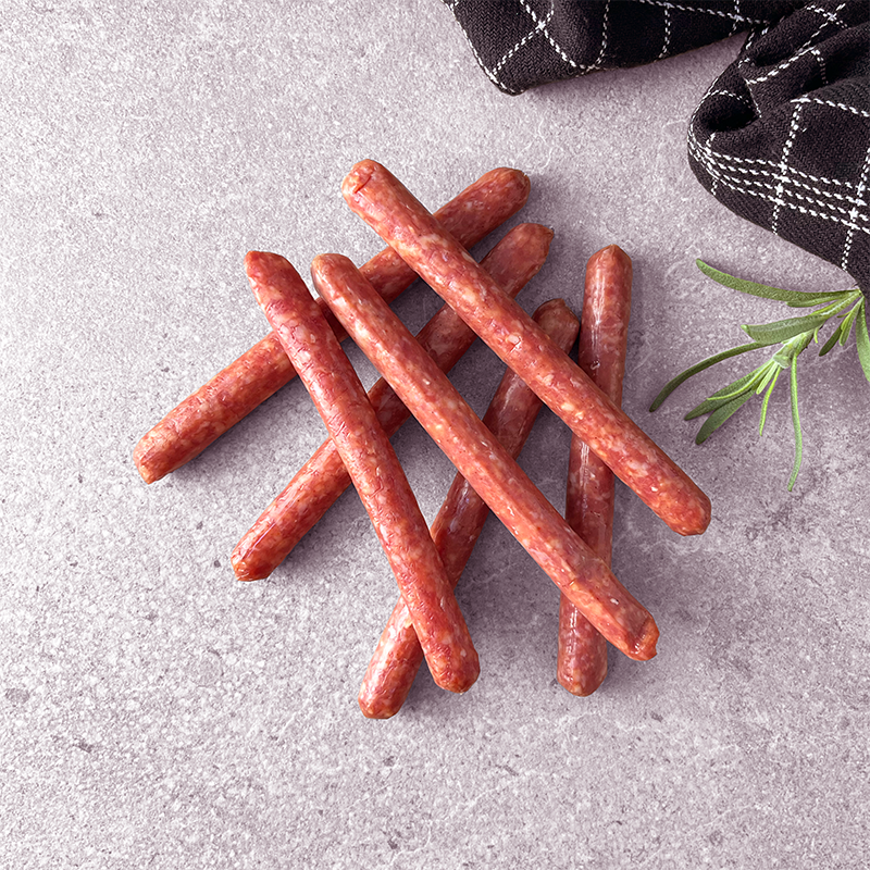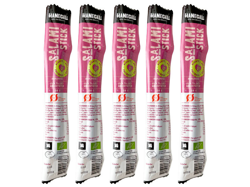 Hanegal Snackpølse af gris – Økologisk, mild og klar til både snack og servering. Mild salamistick af økologisk grisekød, nænsomt krydret med paprika, koriander og peber. Koldrøget over bøgeflis for en afrundet smag og delikat røgprofil. Pakket enkeltvis i folie, hvilket gør dem ideelle som portionspakket snack i kantiner, caféer eller on-the-go-løsninger. Kan også anvendes udpakket og skåret til tapas, frokostanretninger eller som proteinrig snack på salatbuffeten.